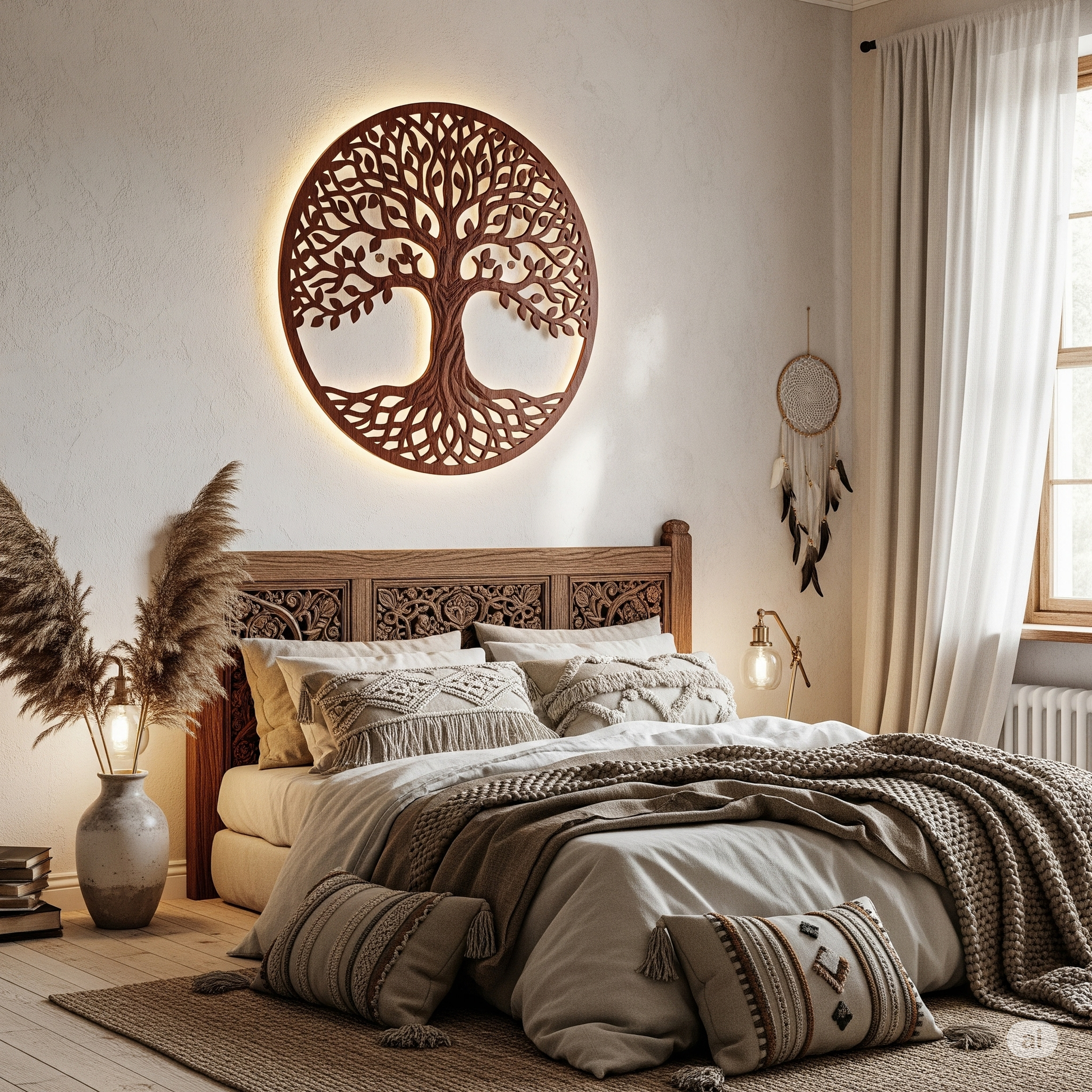 مزودة بإضاءة خلفية ناعمة تضفي جوًا دافئًا وهادئًا مثاليًا لغرفة النوم ذات الطابع البوهيمي الفاخر.